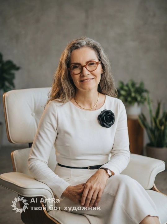 Portrait of an older woman sitting confidently in a modern white leather chair, looking directly at the viewer, medium shot, wearing a white long-sleeved dress, a black flower brooch, a thin black belt, a gold necklace and a watch, against a blurred gray concrete wall and green plants, soft studio lighting, soft shadows, warm and cozy atmosphere, shot with an 85mm portrait lens, shallow depth of field, creamy background with bokeh effect, high detail, photorealistic, 8K resolution