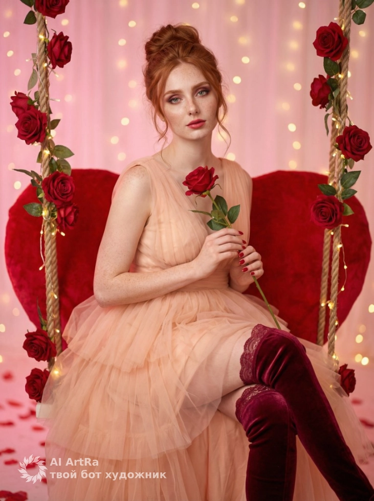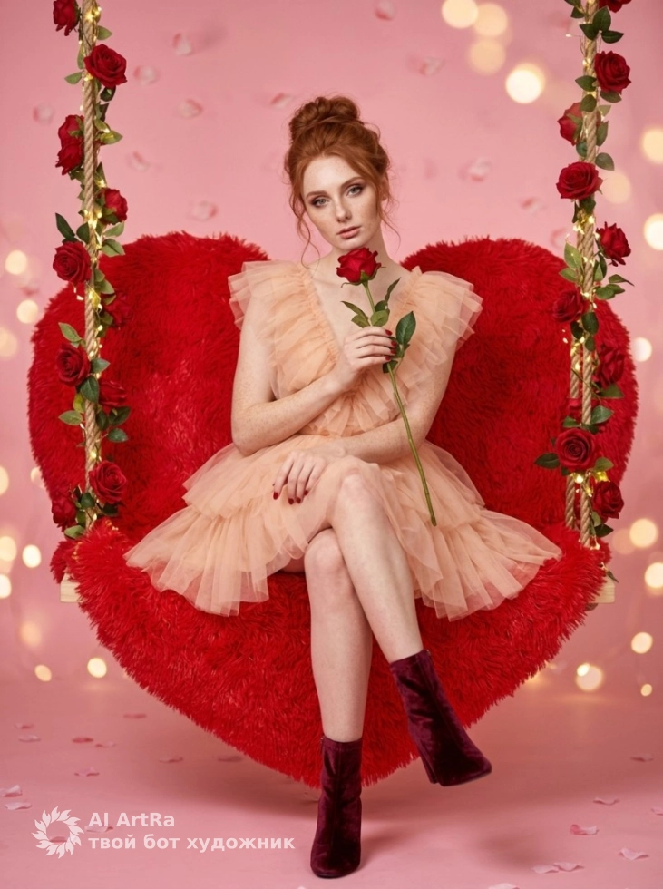 Представьте себя на подвесных качелях в форме сердца, окруженными нежными красными розами и мягким светом. Это не просто фотография, это настроение, которое наполнит ваши публикации чувствами и эмоциями. Благодаря профессиональной съемке и использованию Nano Banana PRO, вы получите наилучшее качество и стабильный результат.