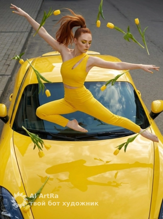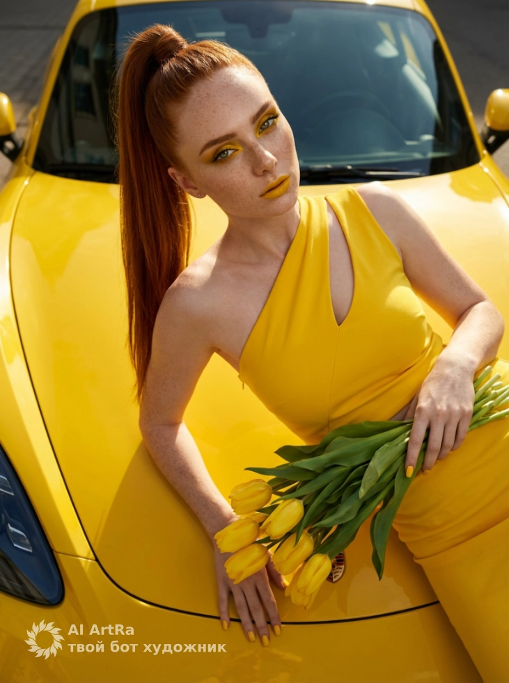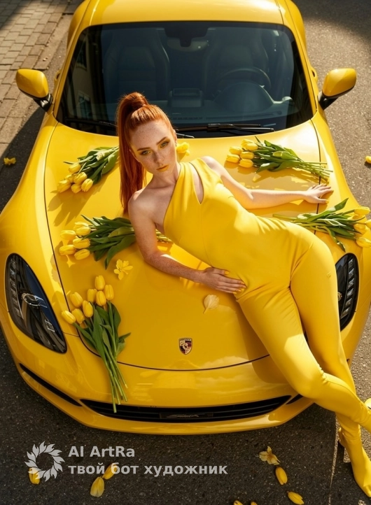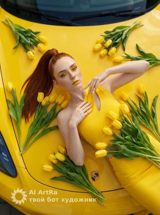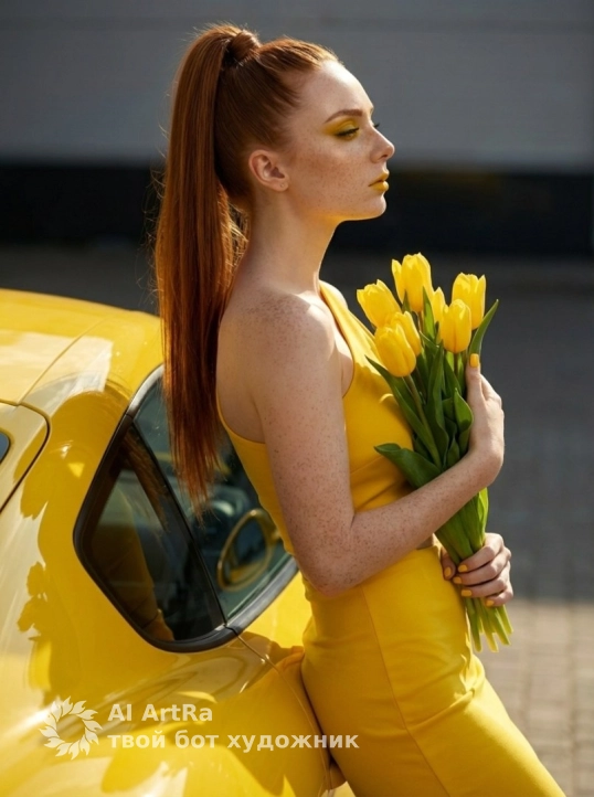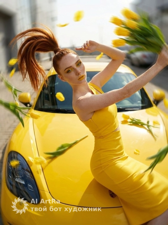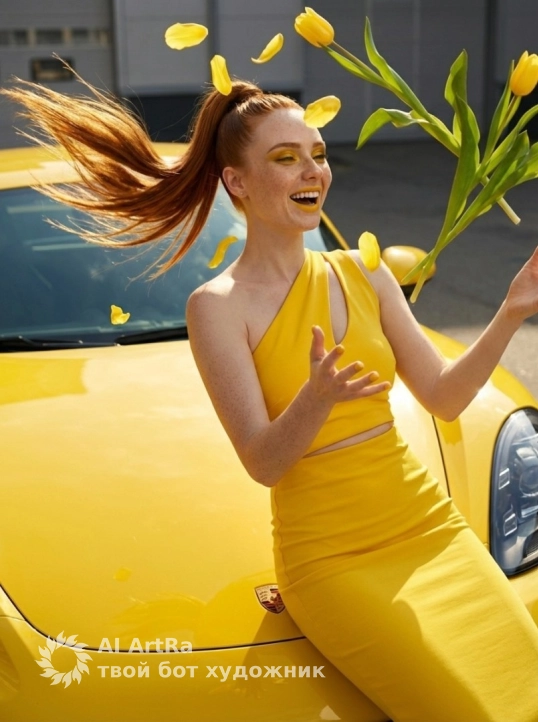 Вдохните жизнь в свои визуальные истории с нашей уникальной фотосессией, где каждый кадр наполнен стилем и индивидуальностью. Представьте себя в роли главной героини: динамичная поза на капоте желтого спортивного автомобиля под яркими лучами света, в потрясающем асимметричном наряде, дополненным свежими желтыми тюльпанами. Это не просто изображение, а целая история, которую вы можете рассказать своим подписчикам.