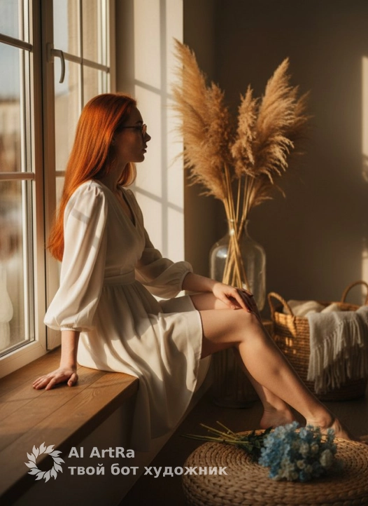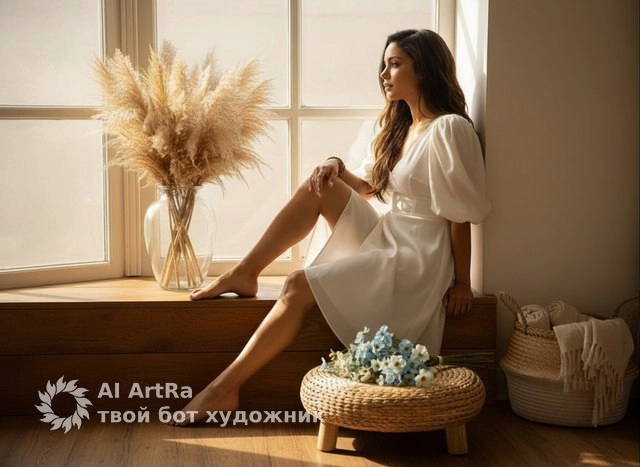 Не меняя внешности женщины с фото, перед нами нежный и атмосферный кадр с теплым солнечным светом, наполняющим комнату мягким золотистым сиянием, которое скользит через большие оконные рамы и подчеркивает древесные текстуры подоконника и пола. Женщина располагается на широком оконном выступе в позе, говорящей о задумчивости и спокойствии: её длинные ноги вытянуты вперед, правая слегка согнута в колене, а левая рука нежно касается подоконника, создавая плавную линию, подчеркивающую изящество её фигуры. Она повернута в профиль, взгляд устремлен в сторону окна, будто наблюдает за чем-то за пределами комнаты, и этот профиль, освещённый рассеянным светом, сохраняет всю индивидуальность лица и выражение легкой мечтательности. Девушка одета в элегантное белое платье с объемными рукавами, текстура ткани выглядит мягкой и нежной, слегка блестящей от падающего света, а сама ткань напоминает утонченное сочетание лёгкого сатина и хлопка, обеспечивающего воздушность и комфорт. Волосы женщины прямые, средней длины, свободно спадают по плечам и частично скрывают часть спины, детали волос неразличимы из-за мягкого освещения, создающего нежное свечение. Интерьер вокруг наполнен элементами природного декора: рядом с женщиной стоит большая прозрачная ваза с пышными ветвями сухих трав, их объемная, пушистая текстура визуально контрастирует с гладкостью платья и дерева. Справа в кадре виднеется плетеная корзина, застеленная мягкими тканевыми покрывалами спокойных кремовых оттенков, создавая уютный и домашний антураж. На полу перед девушкой лежит круглый плетеный табурет, на котором аккуратно размещён небольшой букет из нежно-голубых и белых цветов, структура цветочных лепестков читается точно и живо. Сцена наполнена ощущением тихой утренней или вечерней тишины, в которой смешиваются тепло солнца, природные оттенки и контемплативное настроение, а световой рисунок с длинными тенями добавляет глубину и объем всему пространству, подчеркивая изысканность композиции и мягкость атмосферы, фотореалистичное изображение, высокая текстурная детализация, высокое качество, разрешение 4K.