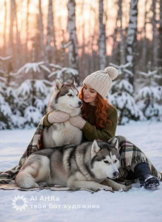 Используйте внешний вид пользователя, референса 1:1 — лицо, кожу, волосы и тело без каких-либо изменений. На переднем плане — женщина в уютной зимней одежде: вязаная шапка с помпоном, тёплый плед с геометрическим узором, перчатки и сапоги, сидящая на снегу между двумя крупными хаски, обнимая одного из них; собаки в зимней шерсти, одна сидит, другая лежит, взгляды направлены в разные стороны; фон — заснеженный зимний лес с размытыми берёзами и елями, золотисто-розовый закатный свет мягко окутывает сцену, создавая тёплую, уютную и сказочную атмосферу; композиция — средний план, камера на уровне глаз, ракурс немного снизу, акцент на взаимодействии человека и животных; стиль — фотореализм с мягким боке, высокая детализация меха, снега и ткани, настроение — спокойное, душевное, зимнее волшебство.