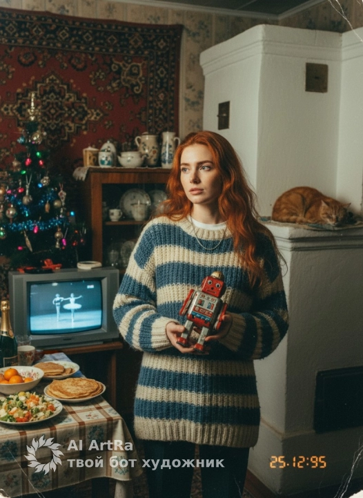 Take the uploaded portrait and transform it into a 90s-style image. The clothing should be characteristic of that time, such as a woolen sweater with a striped undershirt. Add a Soviet-era toy in the hands. Replace the background with an interior of a village house with a white Russian stove, where a 90s cat is sleeping. There is a carpet on the wall, a Soviet-era Christmas tree in the corner, a cupboard, and an old TV showing a ballet performance and a festive New Year's table. Use a hard, direct flash to illuminate the subject, creating a sharp contrast between light and dark areas. The image quality should resemble a film shot, with a grainy texture, slightly blurred edges, and muted colors with bright neon accents. The overall atmosphere should be old-school, as if the photo was taken by a teenager in 1995 using a disposable camera or a first-generation digital SLR. Keep the nostalgic effect — the photo should look like it came from an old family album or a magazine about hip-hop culture.