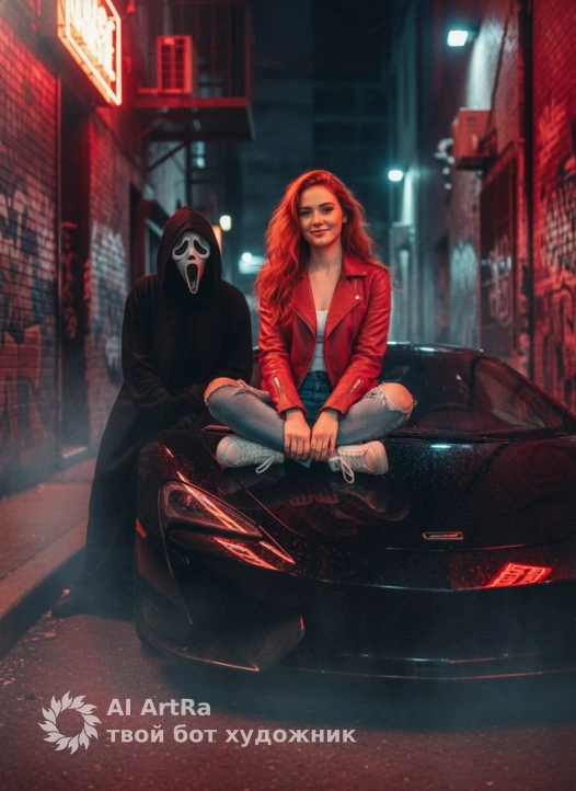 A cinematic, neon-lit urban night scene. A young from uploaded photo sits cross-legged on the hood of a sleek black sports car. She wears a red leather jacket, white tank top, light blue jeans, and white sneakers with cool smile. Next to her, leaning on the car, stands a person in a black hooded cloak wearing a white Ghostface mask from the Scream movies. The background shows graffiti-covered brick walls, red neon lights glowing, and light fog drifting in the street. The atmosphere is moody, stylish, and slightly eerie, with dramatic lighting and reflections on the car.