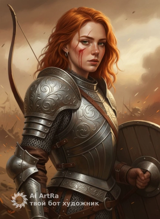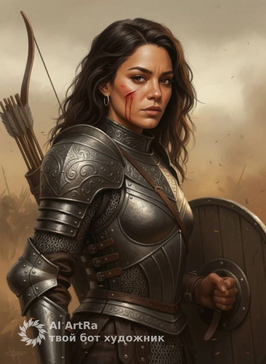 Используйте внешний вид пользователя, референса 1:1 — лицо, кожу, волосы и тело без каких-либо изменений. Цифровая живопись в стиле эпического фэнтези, напоминающая полотна старых мастеров с видимой фактурой кисти и масляной палитры; главный объект — воин в доспехах, повернувшийся вполоборота к зрителю, с напряжённым, сосредоточенным взглядом, на щеке — свежая кровоточащая царапина, на ухе — простое кольцо; на теле — тяжёлый доспех с рельефными узорами и кольчужными вставками, на руках — кожаные наручи с металлическими накладками, в левой руке — круглый деревянный щит с металлическим бугром, за спиной — лук; фон — размытый пейзаж битвы в пыли и дыму, с тёплыми земляными оттенками; освещение — боковое, мягкое, с золотистым отливом, создающее драматические тени и подчёркивающее рельеф доспехов и мускулатуру; ракурс — средний план, слегка снизу, камера чуть сбоку, акцент на выражении лица и деталях брони; атмосфера — напряжённая, героическая, с ощущением усталости после боя и готовности к следующему удару.