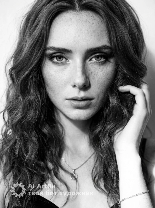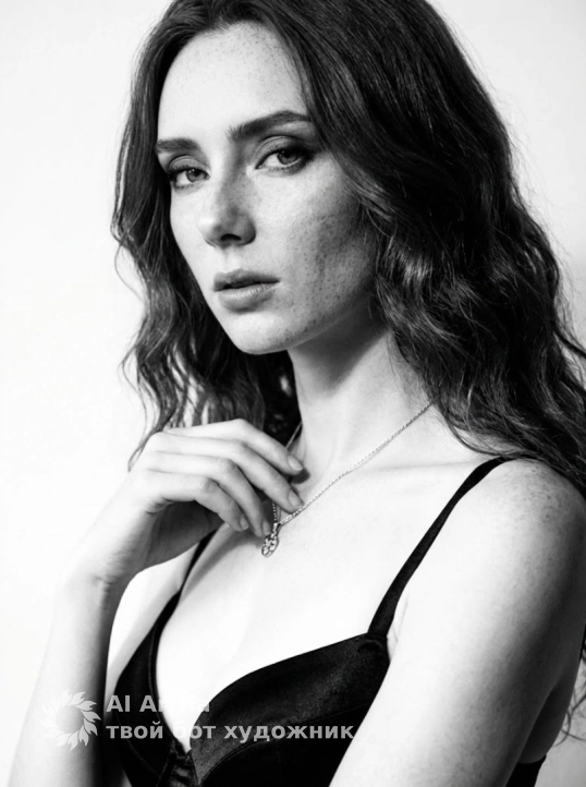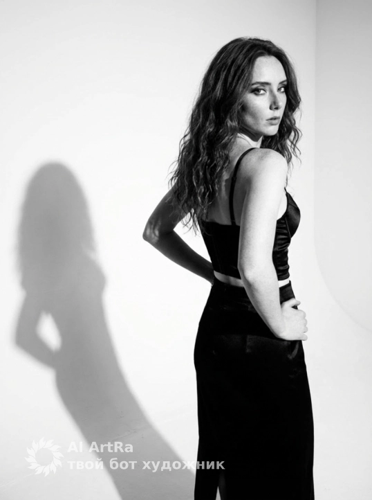 ⦁ Стиль изображения: черно‑белая фотография в глянцевом фэшн‑стиле, высокая контрастность, глубина резкости средняя‑маломерная (фон слегка размыт), мелкое зерно имитации пленки.