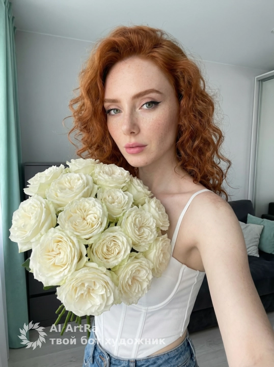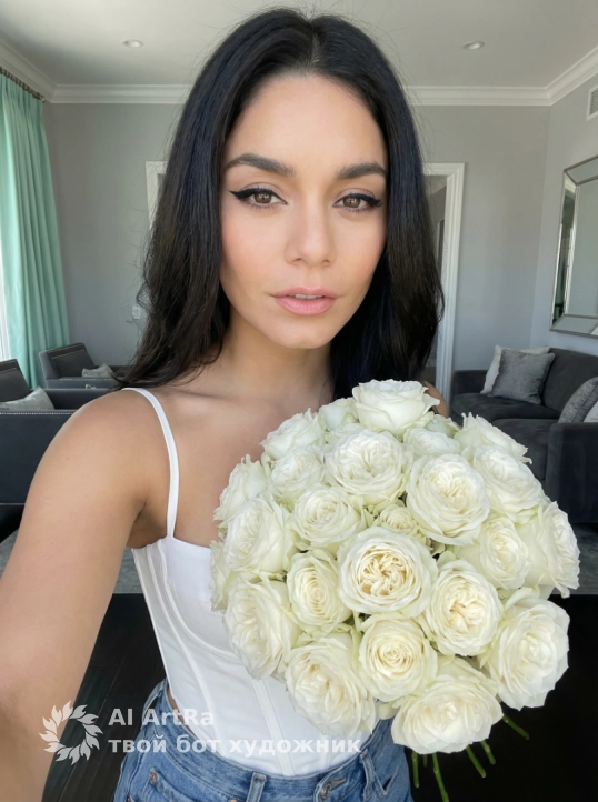 На фотографии интерьерная сцена с красивой девушкой полубоком, смотрит в камеру и держит большой пышный букет белый роз. Девушка одета в белый корсетный топ на тонких бретельках, в синих джинсах