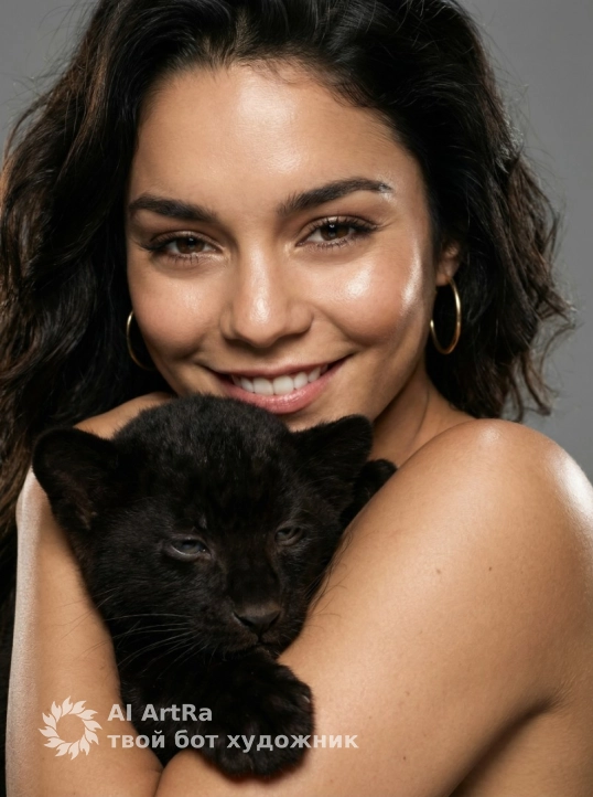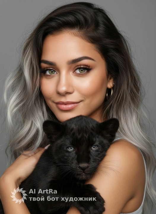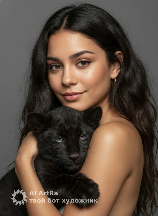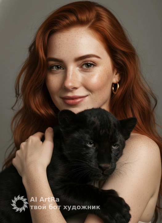 Вертикальный tight close‑up портрет: молодая женщина обнимает чёрного пантерёнка. Тёплая мягкая улыбка, взгляд прямо в камеру, золотая серьга‑кольцо на ухе. Пантерёнок прижат к её плечу и предплечью, бархатистая чёрная шерсть с мягким блеском, полуприкрытые спокойное выражение. Нейтральный серый студийный фон, плотный кадр до плеч, интимная композиция.