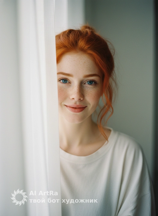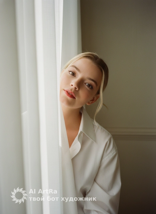 A close-up photo of a woman peeking out from behind a white curtain, looking directly at the camera. The woman is partially hidden by the curtain. She has natural makeup and an even, matte skin tone. She is wearing an oversized cotton shirt. The indoors is a softly lit room next to a window, with a blurred, milky wall in the background. The curtain is sheer, white, and cotton. A very soft ray of sunlight hits her face, diffused natural light (light from the window through the curtain). The sun creates a radiant glow on her skin and hair. Shot with an 85mm portrait lens; shallow depth of field, photorealistic. Film photography style.