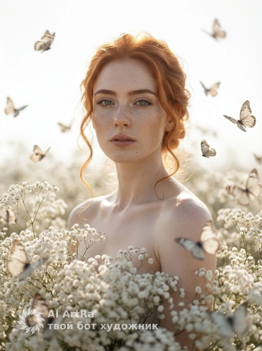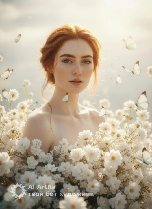 Не меняя внешности женщины с фото, она стоит в окружении нежных белых цветов и множества порхающих бабочек. Тело слегка повернуто вперёд, взгляд прямо в камеру, выражая спокойствие и загадочность. Волосы собраны назад с несколькими локонами, добавляющими естественность. Обнажённые плечи подчеркнуты равномерным светом с мягкими тенями на шее и ключицах. Она словно растворяется в плотном цветочном облаке с бархатистой текстурой, скрывающем нижнюю часть тела. Задний солнечный свет создаёт ореол, придавая волшебную атмосферу. Бабочки разного размера летают вокруг, некоторые размыты движением для глубины и динамики. Фон выгорел светом и неразличим, сосредотачивая внимание на женщине и окружении. Светлые пастельные тона и дымка создают эфемерность и утончённую красоту, эмоциональный настрой умиротворённости, фотореалистичное изображение, высокая детализация, качество 4K.