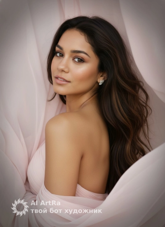 портрет красивой женщины занимает центральные две трети вертикальной рамки, расположенной немного смещенной вправо. Композиция сосредоточена на верхней части торса, плечах и голове, с головой, слегка наклоненной над правым плечом в трехчетвертном профиле.Женщина смотрит прямо в камеру, ее кожа теплого среднего загара имеет гладкую, матовую текстуру и тонкие блики на скулах и лбу, освещенные мягким, рассеянным светом слева. Ее блонд волосы уложены объемно, струясь назад.Лёгкая улыбка на лице, большие глаза.На ней прозрачное , нежно розовое, газовое платье, которое окутывает ее плечи, создавая развевающиеся складки. Женщина утопает в складках платья. Нежно-розовая газовая прозрачная ткань платья женщины поднимается вверх и создает фон за женщиной.Левое плечо поднято к камере, подчеркивая ключицу. Пара небольших бриллиантовых серег сверкает на левом ухе, камера на уровне глаз, эффект виньетирования —s 750 Use the user's appearance 1:1 — face, skin, hair and body without any changes.