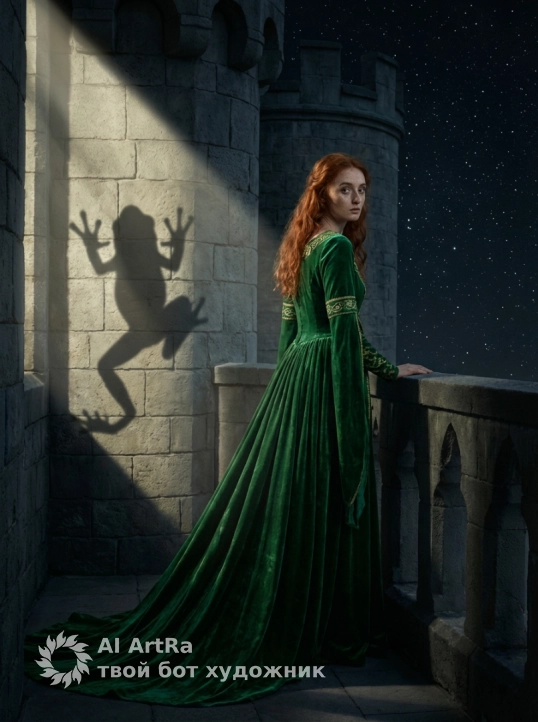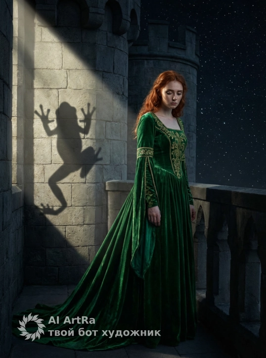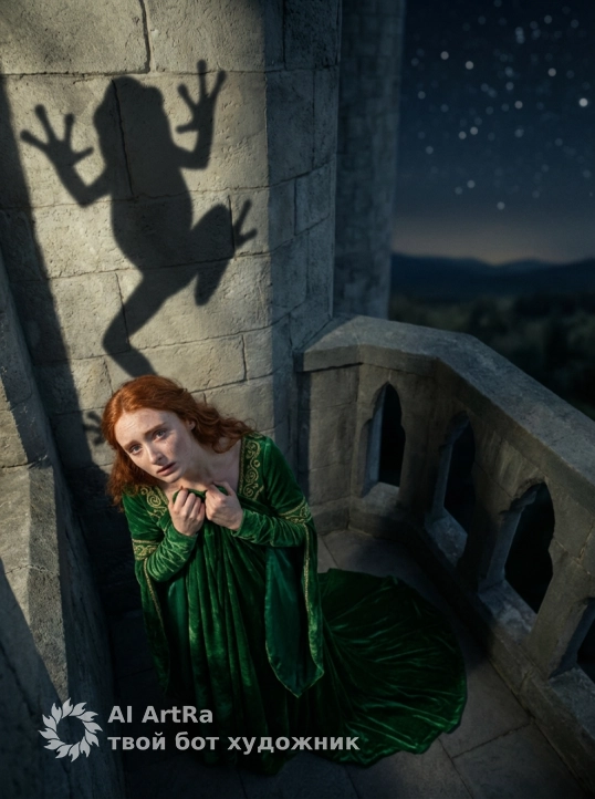 На этом изображении представлена глубокая, сказочная и слегка меланхоличная сцена, переосмысливающая классический сюжет о «Принцессе-лягушке». Не меняй черты лица.