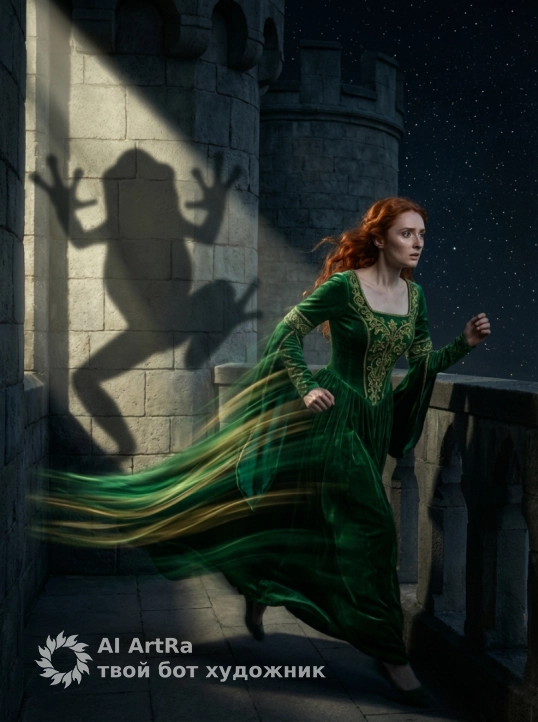 Самая интригующая деталь — это тень на стене. Несмотря на то, что перед нами стоит изящная девушка, свет (напоминающий луч прожектора или яркую полную луну) отбрасывает на каменную кладку силуэт гигантской лягушки.