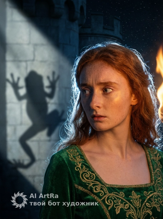 Лягушка запечатлена в динамичной позе, будто она карабкается по стене. Это создает мощный визуальный подтекст: либо это истинная сущность девушки, скрытая под человеческим обликом, либо магическое проклятие, которое тяготеет над ней.