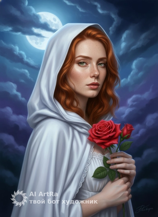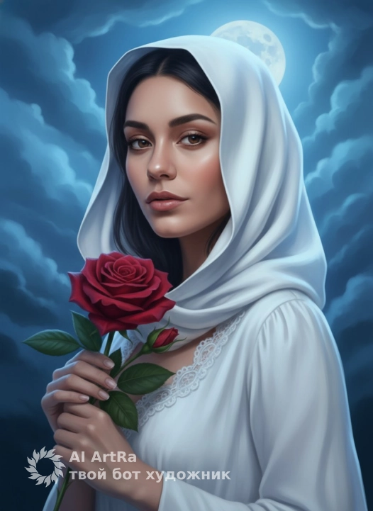 Используйте внешний вид пользователя, референса 1:1 — лицо, кожу, волосы и тело без каких-либо изменений. Цифровая живопись в стиле фэнтези-реализма: молодая женщина в белом капюшоне с мягкими складками, держащая в руках крупную алую розу с зелёными листьями и бутоном, взгляд направлен прямо на зрителя, поза спокойная, полупрофиль, кадр средний план, ракурс немного снизу, фон — ночное небо с луной и дымчатыми облаками, освещение мягкое, синевато-голубое, с акцентом на лицо и розу, настроение мистическое и романтичное, макияж натуральный с акцентом на губы, украшений нет, одежда — белое платье с кружевной отделкой под капюшоном, маникюр и педикюр не видны, атмосфера — загадочная, волшебная, с намёком на тайну.