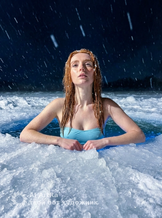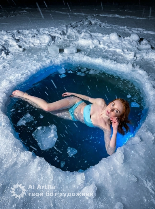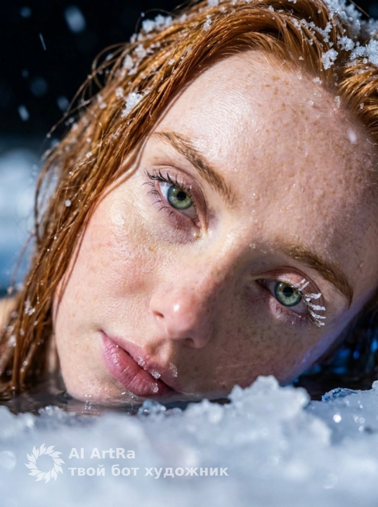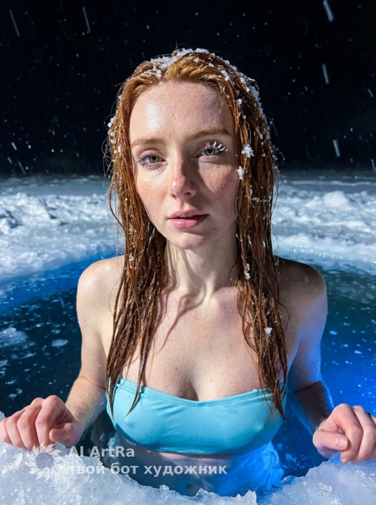 портрет девушки, фото iPhone со вспышкой — женщина в зимнем ночном прорубе . Вода вокруг неё мягко подсвечена голубым светом,во льду создавая ощущение ночной сцены на улице. Идет снег плотно падает .Свет от подсвеченной воды отражается на её коже, делая её особенно выразительной и мягкой. Текстура кожи гипердетализация - видимые поры, естественные тени, тонкий блеск при резком прямом освещении вспышки. Волосы сырые прямые. Девушка погружена в прорубь по грудь, упираясь или держась за льдинку,у неё раздельный купальник нежно голубой без лямок.Лицо женщины в фокусе, слегка глядя в в камеру,на волосах и ресницах лежит снег . Фон: ночь,звезды,снег. Освещение: резкая фронтальная вспышка, сильные блики на носу, скулах и очках, глубокие тени под бровями и линией челюсти. Настроение: интимное, крутое, кинематографическое, редакционное. Никаких украшений, никаких аксессуаров. Плотный кадр с фокусом на лице и верхней части туловища женщины