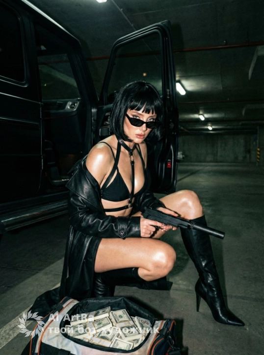 В руках она держит пистолет чёрный с глушителем, перед ней сумка спортивная с долларами