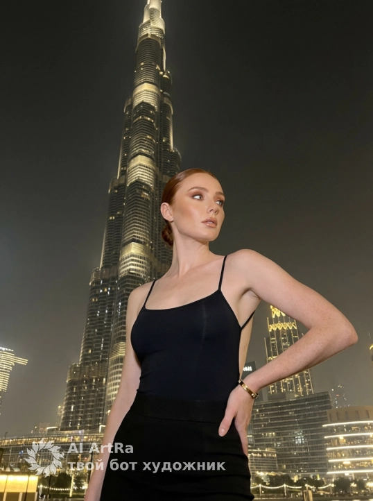 A photograph of a woman against a backdrop of a nighttime city dominated by the Burj Khalifa. The woman is positioned in the foreground, on a street, in an urban setting. In the background, the skyscraper takes up most of the frame, rising upward and extending beyond the top of the image, emphasizing the scale and height of the architecture.