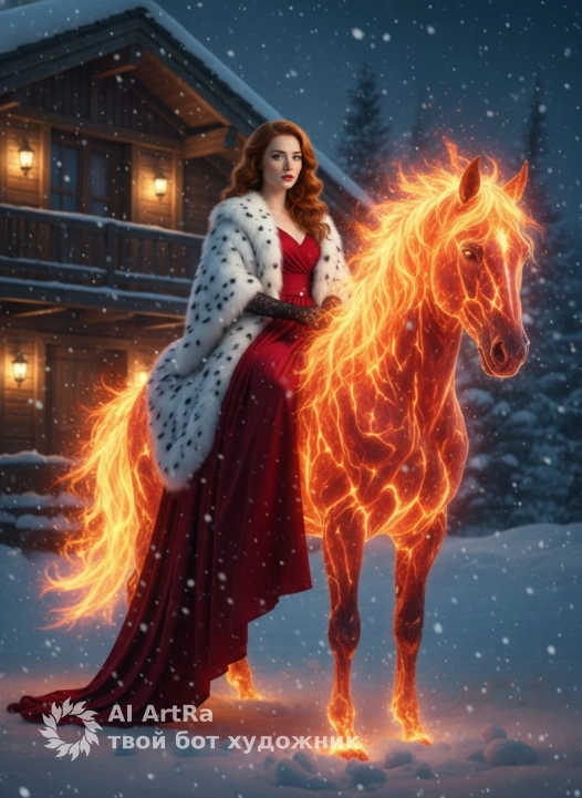 ОСНОВНОЙ СЮЖЕТ: Роскошная молодая женщина сидит верхом на мифическом огненном коне на фоне заснеженного деревянного шале. Ночь, идет мягкий пушистый снег, крупные снежинки в воздухе.