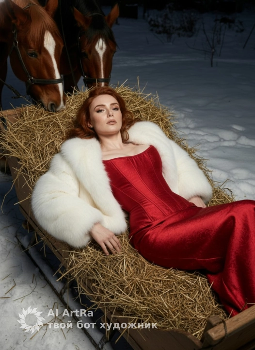 Девушка в красном корсетном платье по фигуре с рукавами, лежит позирует как модель на повозке зимой на стоге сена, сверху у неё накинута белая шуба дорогая