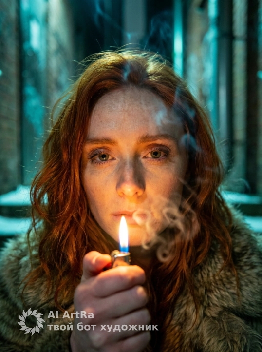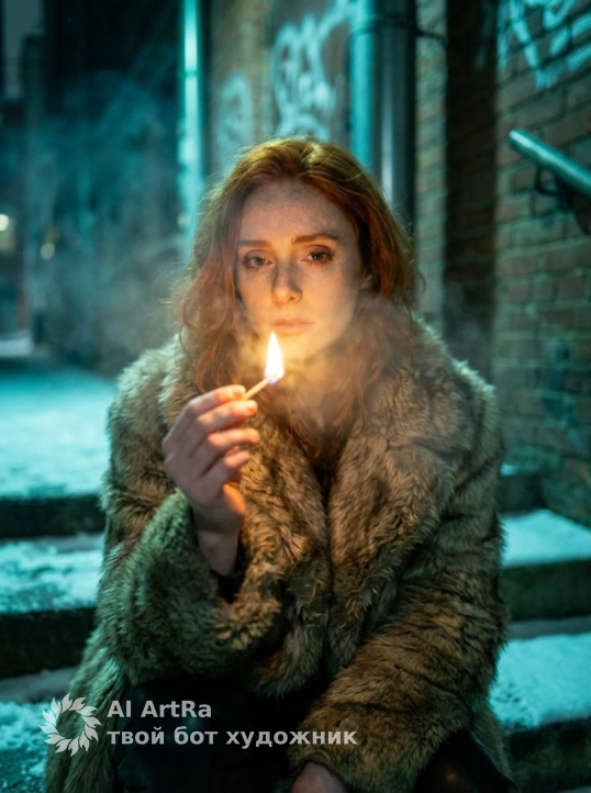 She holds a lighted match to her face, and the small flame flickers and waveres. The warm orange light softly illuminates her fingers, lips, cheek and fur collar, and the smoke from the match rises in a thin stream.
