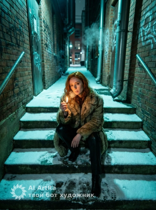 A very cinematic, hyper-realistic fashion editorial scene in the neo-noir style, shot as a frame from a 35mm film, at night in a narrow snow-covered alley.