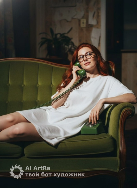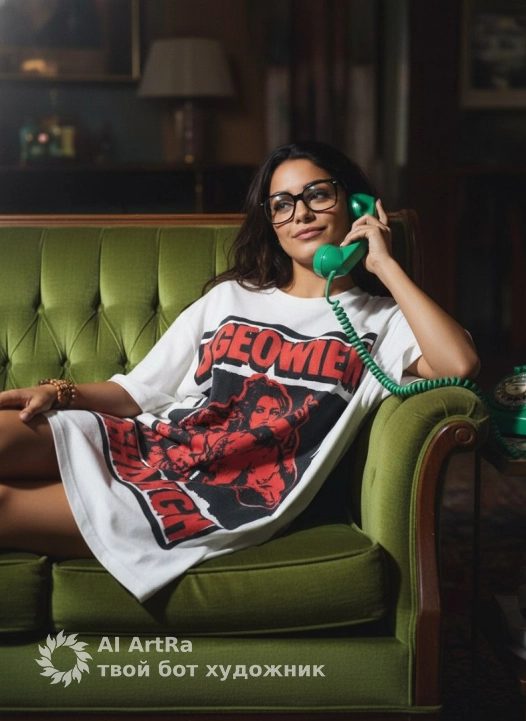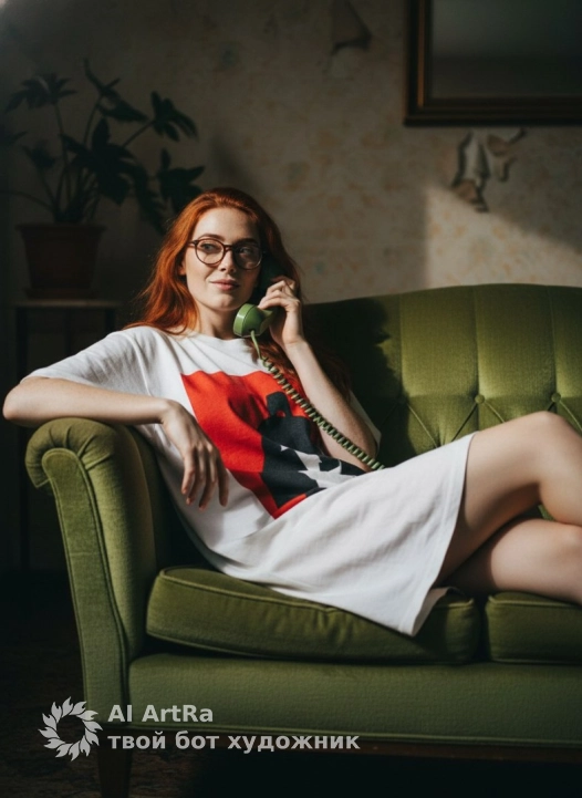 Scene: girl reclining on a green vintage sofa, holding a green corded telephone while glancing above the glasses. Outfit: oversized white T-shirt dress with a bold red- and-black print. Lighting: flash photo aesthetic, direct harsh light with soft falloff on background Camera: horizontal framing, mid-shot emphasizing her relaxed posture and expression. Mood: late-night retro vibe — ironic, confident, effortlessly cool.