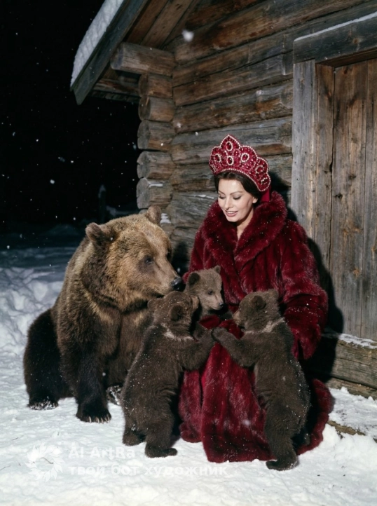 Девушка сидит около стены деревянной избы, зимой. Одета в красную дорогую шубу и красный усыпанный драгоценными красными камнями не большой кокошник. Рядом сидит большой медведь и маленькие медвежата вокруг и на девушке тоже. Идет легкий снег, фото со вспышкой. Девушка смотрит на медвежат