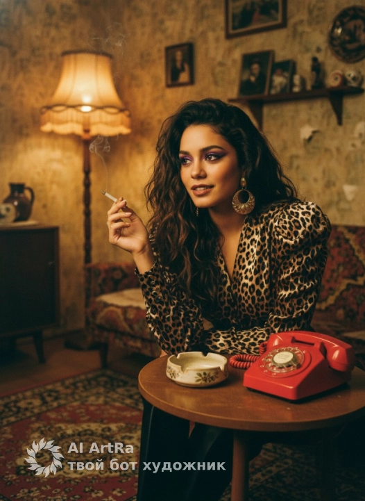 retro portrait, 1980s fashion, bohemian interior, vintage woman, red telephone, leopard print blouse, puffed sleeves, gold earrings, purple eyeshadow, voluminous curly hair, cinematic lighting, Soviet apartment, nostalgic vibe, melancholic glamour, vintage decor, oriental carpet, fringe lamp, smoking, cigarette, intimate atmosphere, golden brown palette, textured fabric, old phone, ashtray, artistic photography, film noir style, 80s makeup, boho chic, vintage lifestyle, retro inspiration, промт для фотосессии, промты, 90-е, фото времене девяностых, промт для фото в стиле девяностых