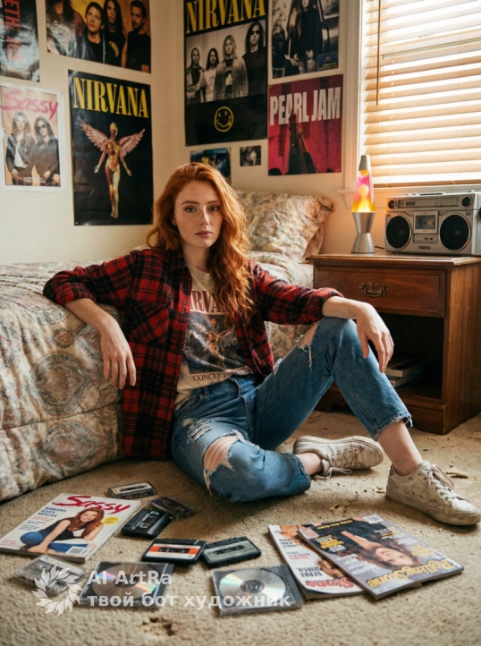 Используйте внешний вид пользователя, референса 1:1 — лицо, кожу, волосы и тело без каких-либо изменений. Девушка сидит на полу в уютной комнате, прислонившись спиной к кровати, в расслабленной позе с согнутыми коленями и одной рукой, лежащей на бедре, другая свободно опущена вдоль тела; на ней расстегнутая красно-черная клетчатая рубашка поверх светлого топа с выцветшим принтом, рваные джинсы и белые кеды; макияж естественный, с акцентом на подчеркнутые брови и легкий блеск на губах; ногти короткие, без маникюра; украшений нет; вокруг нее разбросаны кассеты, диски и стопка журналов; на заднем плане — стена с винтажными постерами, прикроватный столик с лампой и радиоприемником, окно со светлыми жалюзи; освещение мягкое, теплого желтоватого оттенка, создающее ностальгическую, уютную атмосферу 90-х; стиль — реалистичная фотография с легкой зернистостью и теплой цветовой гаммой; ракурс — средний план, съемка с небольшого наклона вниз, камера на уровне пояса, фокус на лице и верхней части тела; композиция сбалансирована, с глубоким фоном, создающим ощущение личного пространства и непринужденности.
