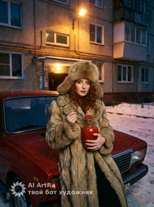 Создай портрет, не меняя черты лица. Фотография молодой женщины с длинными волнистыми волосами в стиле «Russian Mob Wife», она одета в шикарную меховую длинную шубу и большую меховую шапку-ушанку. Девушка стоит и облокачивается на капот старого советского автомобиля красного цвета на фоне ночного подъезда панельного дома. В руках она держит огромную стеклянную банку с красной икрой и в другой руке металлическая ложка с икрой. Освещение теплое, кинематографичное, от уличного фонаря над дверью. Зима. Атмосфера ностальгии, высокая мода, эстетика 90-х, высокое разрешение, реализм. Стиль: Slavic Core, Mob Wife aesthetic, 90s vintage.
