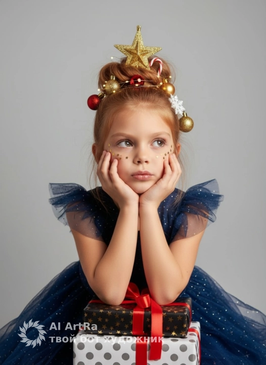 Не меняя внешности девушки с фото, изображение наполнено атмосферой праздничного волшебства и детской мечтательности. Девочка сидит, чуть наклонившись вперёд, поддерживая лицо обеими руками, что создаёт ощущение задумчивости и лёгкой усталости от ожидания подарков. Её взгляд устремлён вверх и в сторону, кисти рук плотно прижаты к щекам, а губы чуть поджаты, словно она надувает их или собирается задуть воображаемые искрящиеся звёзды вокруг. На ней надето нарядное платье из тюля и ткани с блестящей и слегка прозрачной структурой, цвет платья глубокий, темно-синий или серо-синий, подчёркивающий торжественное настроение. Плечи покрыты мелкими рюшами из лёгкого материала, создающими объём и воздушность. Волосы девушки собраны вверх в высокий пучок, который украшен множеством новогодних украшений: блестящая золотая звезда венчает верхнюю часть причёски, вокруг собраны красные и золотые новогодние шары, снежинка и леденец, а также тонкая гирлянда с маленькими огоньками, которая нежно обвивает волосы, придавая всему образу праздничную сияющую эстетику. Лицо украшено декоративным макияжем из блестящих элементов в виде маленьких золотистых звёздочек, а на губах лёгкий переливающийся блеск, подчёркивающий юную игривость и радость момента. На переднем плане видны два аккуратно упакованных подарка: нижний — в белой упаковке с серыми крупными горошинами, верхний — в чёрной обёртке с золотыми звёздами и яркой красной лентой, контрастирующей с общей холодной палитрой изображения. Фон нейтральный, светло-серого цвета, что позволяет максимально сфокусировать внимание на героине и её ярком праздничном образе. Свет мягкий и рассеянный, идёт преимущественно сверху и немного слева, отбрасывая нежные тени и подчёркивая текстуры ткани платья и декора в волосах, создавая объём и глубокую атмосферу волшебного ожидания праздника, фотореалистичное изображение, высокая текстурная детализация, высокое качество, разрешение 8K.
