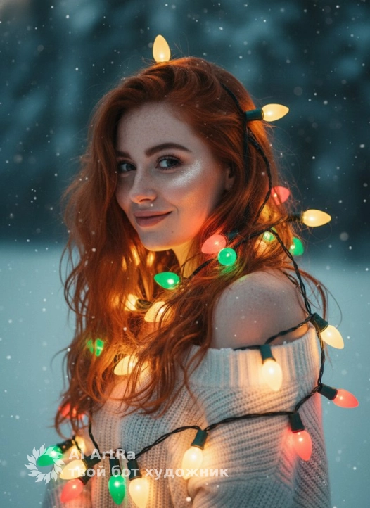 Экстримально близкий детализированный портрет лица Девушка с открытыми плечами в белом свитере стоит на фоне заснеженного пейзажа. Скулы подсвечены хайлайтером, ресницы четко прорисованны. На её плечах и волосах обвита гирлянда с крупными яркими красными, зелёными и жёлтыми огоньками, создающими теплый свет, который мягко освещает её лицо и верхнюю часть тела, она прямо перемотана гирляндой Она слегка повернута в профиль, с лёгкой улыбкой на губах, её глаза яркие и выразительные, а макияж акцентирован на губах и глазах, создавая игривый и праздничный образ. Волосы свободно падают, создавая лёгкие волны. На её плечах видны снежинки, а фон — ночной зимний лес с мягким снежным покровом, создающий атмосферу уюта и новогоднего праздника. Свет от гирлянды придаёт сцене волшебное и тёплое сияние. Кинематографический стиль Мелкая зернистость