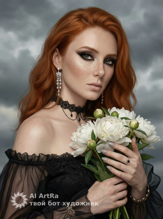 Используйте внешний вид пользователя, референса 1:1 — лицо, кожу, волосы и тело без каких-либо изменений. На лице — драматичный макияж с тёмной, растушёванной стрелкой, обрамляющей глаза, и тонким слоем матовой пудры на коже, создающим эффект бархатистой текстуры; губы слегка припудрены нейтральным оттенком. На пальцах — аккуратный маникюр с матовым светло-серым или пудровым покрытием, без блесток или декора. На шее — кружевной чокер с тонкой вышивкой и подвесками, на ушах — длинные каскадные серьги с кристаллами, на пальце — тонкое кольцо с тёмным камнем, на запястье — браслет с орнаментом. Главный объект — женщина в позе полупрофиля, смотрящая прямо в камеру, держащая в руках букет из белых пионов с зелёными бутонами и листьями. Стиль — цифровая живопись с элементами фэнтези, гиперреалистичной текстурой кожи и ткани, с мягким размытием фона. Окружение — мрачное небо с серыми облаками, создающее атмосферу меланхолии и таинственности. Освещение — мягкое, рассеянное, с боковым источником света, подчеркивающим рельеф лица и складки ткани. Камера — средний план, фронтальный ракурс с лёгким наклоном вверх, фокус на лице и букете. Объект расположен в центре кадра, занимает большую часть пространства, масштаб — от груди до верхней части головы. Атмосфера — мистическая, элегантная, с нотками готической романтики. Одежда — чёрное платье с открытыми плечами, кружевным лифом и длинными прозрачными рукавами с оборками. Поза — спокойная, с руками, сложенными перед собой, держащими букет, голова слегка наклонена вперёд, взгляд пронзительный и задумчивый.