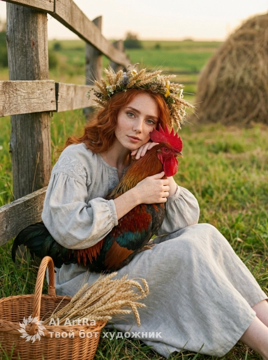 Используйте внешний вид пользователя, референса 1:1 — лицо, кожу, волосы и тело без каких-либо изменений. На изображении — женщина в нежно-сером льняном платье с пышными рукавами и вышивкой на лифе, сидящая на земле у деревянного загородка, обнимая пёстрого петуха с ярко-красным гребнем; на голове — венок из сухих колосьев и полевых цветов; макияж естественный, с акцентом на выразительные брови и румяна на щеках, губы слегка подкрашены; ногти короткие, натуральные, без лака; украшений нет; рядом на траве — плетёная корзина с пучком колосьев; фон — сельский пейзаж с соломенным стогом и зелёной травой; освещение мягкое, рассеянное, с тёплым золотистым оттенком, создающее атмосферу умиротворённой идиллии; стиль — реалистичная фотография с художественной обработкой, напоминающей ретро-фильм; ракурс — средний план, снятый чуть снизу, камера расположена на уровне талии, композиция симметричная, объект занимает центр кадра; поза — расслабленная, с лёгким наклоном вперёд, взгляд направлен в сторону, улыбка теплая и искренняя; настроение — спокойное, сельское, ностальгическое, с намёком на сказочность.