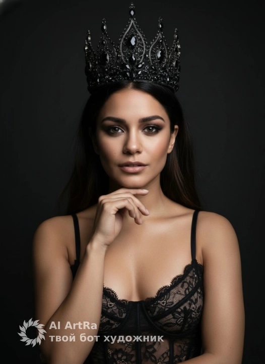 Composition: centered portrait, sharp focus on eyes, crown and hand gesture; background fully blurred black; extremely high dynamic range; ultra-sharp 8K rendering; natural skin texture without smoothing; deep shadows with smooth gradients; micro-reflections on crystals, lace and skin.