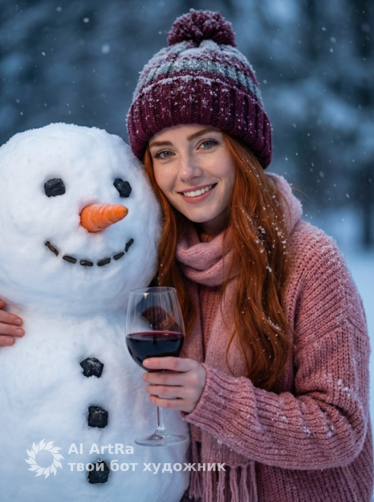 Не меняя внешности женщины с фото, перед нами живописная зимняя сцена, наполненная атмосферой уюта и радости. Женщина стоит в обнимку с большим снеговиком, её тело обращено к камере, а лицо смотрит на камеру , что подчеркивает близость и дружескую теплоту момента. На ней крупно вязанный свитер шероховатой фактуры нежного розово оттенка, который гармонично сочетается с мягким шарфом того же цветового диапазона, плотно обернутым вокруг шеи. Голову украшает объемная крупная шапка с помпоном, выполненная из толстой пряжи насыщенно бордового цвета с тонкими полосами серого, на которой отчетливо видны снежинки, слегка растаявшие и приглаженные, словно свежий снег. Длинные светлые волосы аккуратно свободно спадают на плечи, их текстура и блеск хорошо различимы, создавая контраст с матовой вязкой одежды. Женщина улыбается, выражая искреннее удовольствие и тепло, её лицо освещено мягким рассеянным светом, который подчеркивает естественную красоту и оттенки кожи, а также мелкие снежинки, плавно падающие вокруг и частично осевшие на лице. В руке она держит изящный бокал с красным вином, который ярко выделяется на фоне белого снега, создавая живой цветовой акцент. Снеговик рядом с ней крупный, его лицо тщательно сформировано с выразительными черными угольными глазами и улыбкой из мелких угольков, а нос — ярко-оранжевая морковка с естественной текстурой; грудная часть украшена тремя крупными черными пуговицами из того же материала. Вся сцена наполнена легким снежным мартовским вечером, с глубокой, холодной цветовой гаммой, где доминируют мягкие голубовато-серые и белые тона фона, создавая атмосферу покоя и волшебства. Тени и свет мягко обволакивают фигуры, придавая сцене объем и глубину, а легкое движение снежинок оживляет композицию, усиливая ощущение праздничного настроения и тепла даже в зимнюю стужу, фотореалистичное изображение, высокая текстурная детализация, высокое качество, разрешение 4K.