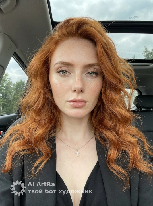 Создай не меняя черты лица.Селфи женщины с объёмными волнистыми волосами с боковым пробором, волосы слегка растрёпаны ветром, идеально гладкая кожа с естественным сиянием, большие выразительные глаза с прокрашенными ресницами, идеальные брови, глянцевые нюдово-розовые губы, лёгкий естественный макияж, на ней черный топ с глубоким V-образным вырезом и чёрный жакет нараспашку, тонкая серебряная цепочка с небольшим крестиком на шее, она сидит в машине с открытым люком, небо и деревья видны через люк, пасмурный день, мягкий естественный дневной свет, реалистичное селфи с фронтальной камеры, высокая детализация кожи и волос, ультрареалистично, 8K