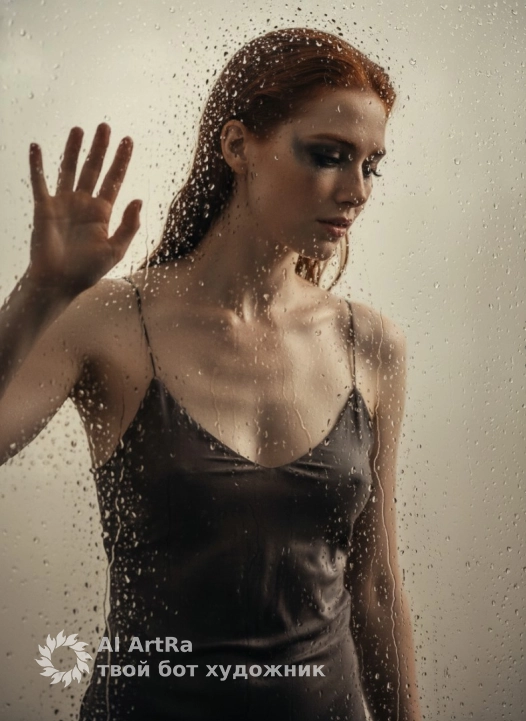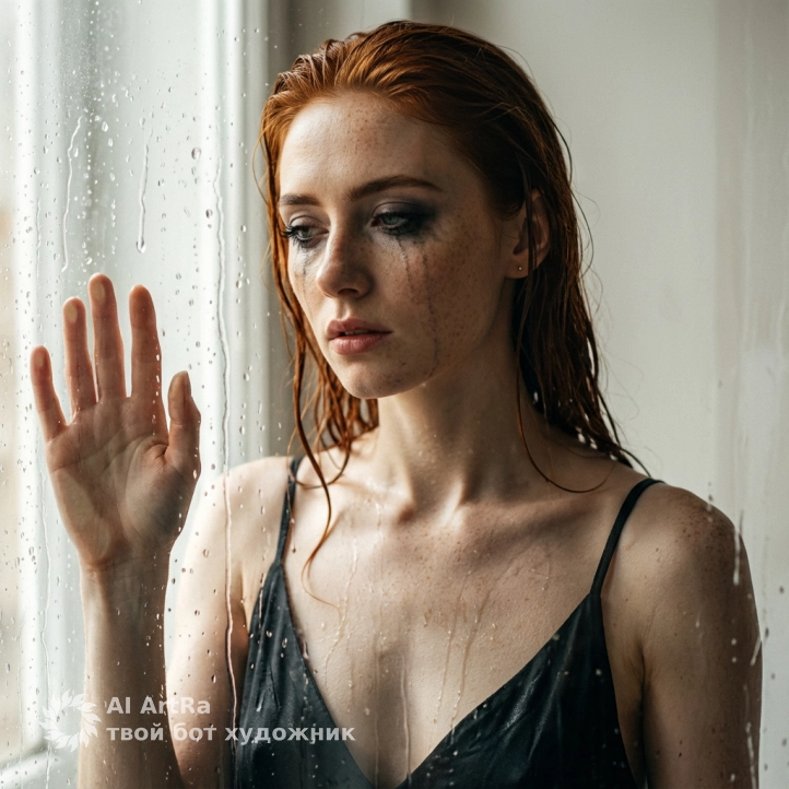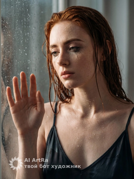 Поза и композиция: я стою за запотевшим стеклом, полностью покрытым крупными каплями воды, кадр по грудь. корпус чуть развёрнут в три четверти, лицо повернуто в сторону от камеры, подбородок слегка опущен, взгляд опущен или прикрыт, выражение лица драматичное и немного уставшее. одну руку я подношу к стеклу и прижимаю ладонь к нему – пальцы раскрыты, линия кисти красиво читается сквозь капли воды. вторая рука остаётся ниже, не в кадре или лишь намечается.