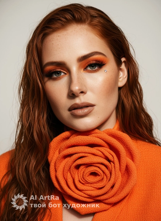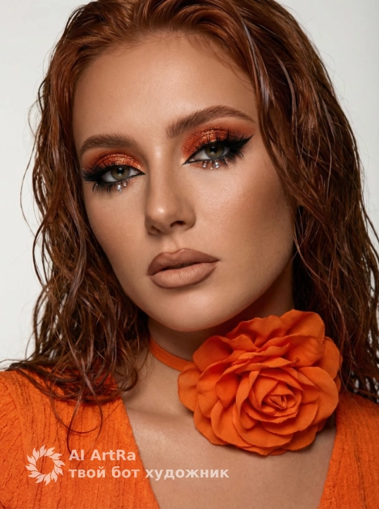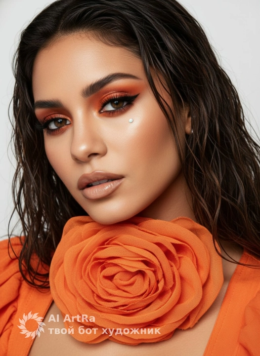 Не меняя внешности женщины с фото, кинематографический портрет с детальной текстурой и утонченным светом. Голова слегка наклонена в бок , кожа гладкая и бархатистая с теплым бегу и загаром . Волосы влажные, волнистые с прохладными бликами и тенями. Взгляд вниз и в камеру , с ярким макияжем: глубокий оранжевый блеск на веках, четкие черные стрелки, под нижними ресницами переливающийся кристалл. Губы, бежевые с коричневым контуром , четко очерченные, бархатистые. Ресницы густые черные эффект рваный .Одежда — ярко-оранжевая ткань с текстурой, контрастирующая со светлой кожей. На шее крупный оранжевый текстильный цветок повязка с объемными лепестками. Фон нейтральный, почти белый, студийное освещение сверху спереди, создающее мягкие тени и кинематографическую глубину. Атмосфера — яркость и утонченность, раскрывающие силу и стиль, фотореалистично, высокая детализация.