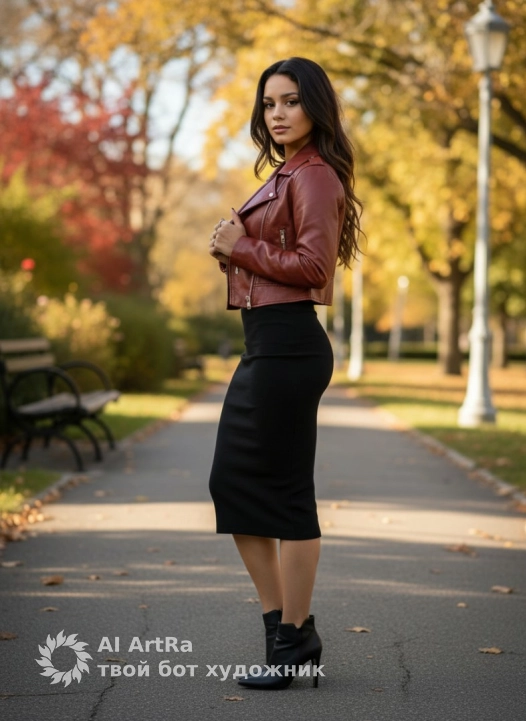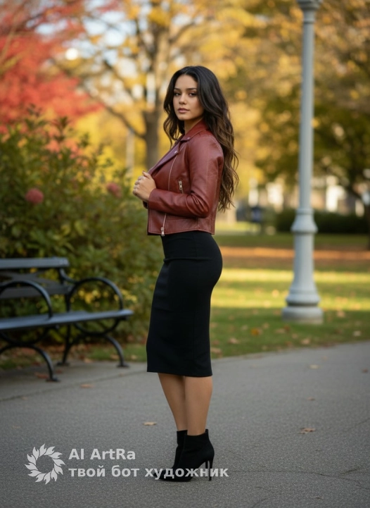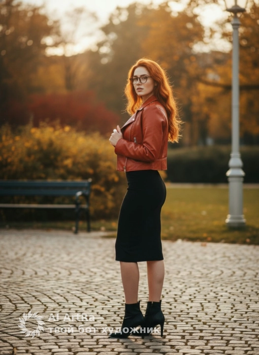 Не меняя внешности женщины с фото, стройная девушка с длинными стоит боком на мощеной дорожке в парке. Взгляд направлен в камеру с легкой задумчивостью и уверенным выражением, сохраняя естественные черты. Она в облегающем черном платье средней длины и черных сапогах на тонких каблуках, подчеркивающих ноги. Верхняя одежда — короткая рыжая кожаная куртка с легким блеском, создающая контраст с платьем. Руки прижаты к куртке. Поздний осенний свет мягко освещает сцену, подчеркивая теплые оттенки куртки и волос, создавая плавные тени. Фон — осенняя зелень с желтыми и красными размытыми листьями, эффект боке. Слева черная скамейка и кусты, далее лиственные деревья в смене сезона. Справа светло-серый фонарь, придающий уютный городской настрой. Атмосфера осеннего тепла, легкой прохлады, ожидания, фотореалистичное изображение, высокая детализация, 4K.