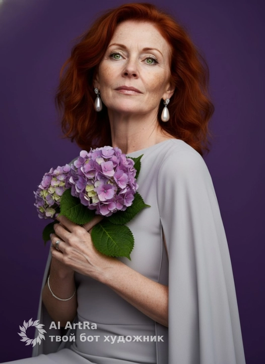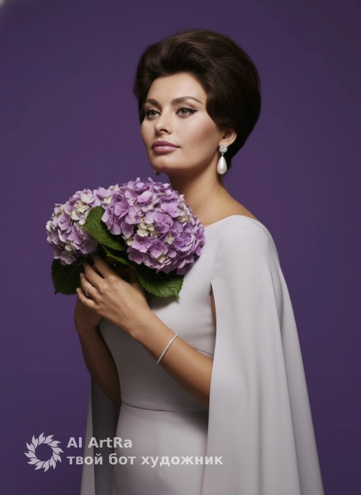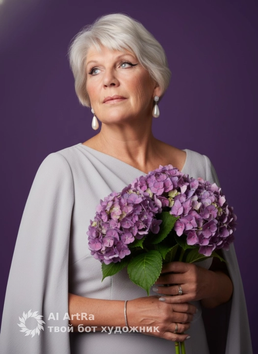 Используйте внешний вид пользователя, референса 1:1 — лицо, кожу, волосы и тело без каких-либо изменений. На изображении — женщина в элегантной позе, слегка наклонившая голову вверх и в сторону, с выражением спокойной уверенности и нежной задумчивости; она одета в светло-серое платье с асимметричным вырезом и широкими рукавами, напоминающими накидку; в руках держит пышный букет фиолетовой гортензии с зелёными листьями, аккуратно прижатый к груди; макияж подчеркивает глаза — чёткий стрелочный карандаш, тени с мерцанием, румяна на скулах и блестящие губы; на ушах — крупные каплевидные серьги с жемчужинами, на левом запястье — тонкий серебряный браслет, на пальцах — минималистичные кольца; маникюр — короткие ногти с матовым светлым лаком; фон — однотонный пурпурный, создающий контраст и акцентирующий фигуру; освещение мягкое, студийное, с боковым источником, подчёркивающим объём и текстуру ткани и кожи; ракурс — средний план, снятый с лёгким нижним углом, что придаёт образу величественности; стиль — высококачественная студийная фотография с элементами классической портретной эстетики, с акцентом на детализацию ткани, цветов и украшений; атмосфера — роскошная, романтичная, с ноткой ностальгии по эпохе 60-70-х годов.