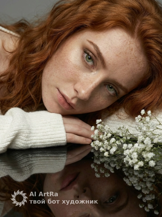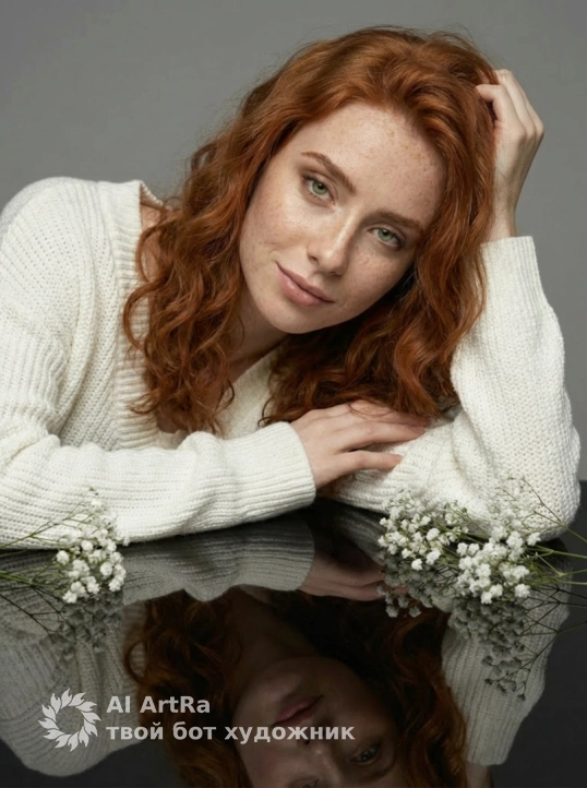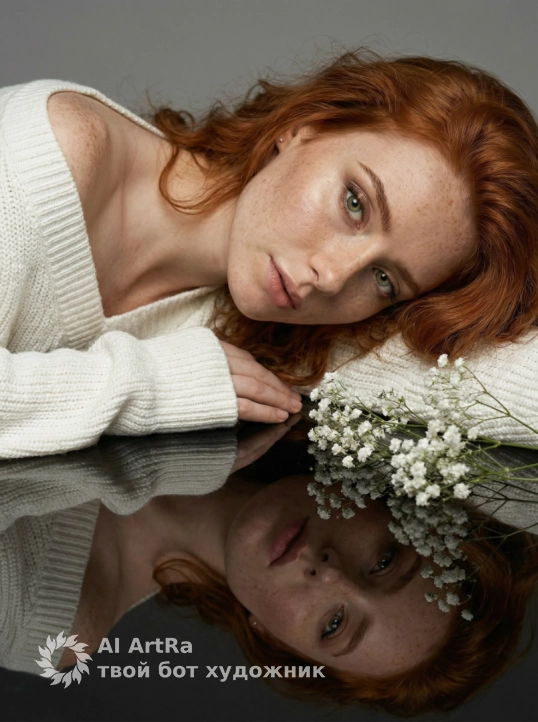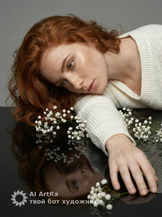 Создай портрет, не меняя черты лица. Профессиональный студийный портрет крупным планом: молодая женщина с длинными волнистыми волосами, и белом вязаном оверсайз свитере , плечо открыто, лежит на зеркальной поверхности. Рядом с ней лежат белые нежные цветы. Ее лицо отражается в черном глянцевом полу. Освещение мягкое, студийное, создающее нежные тени. Эстетика минимализма, нейтральный серый фон, высокая детализация, гиперреализм,Soft studio lighting, minimalist aesthetic, neutral grey background, hyper-realistic, 8k resolution, cinematic composition.