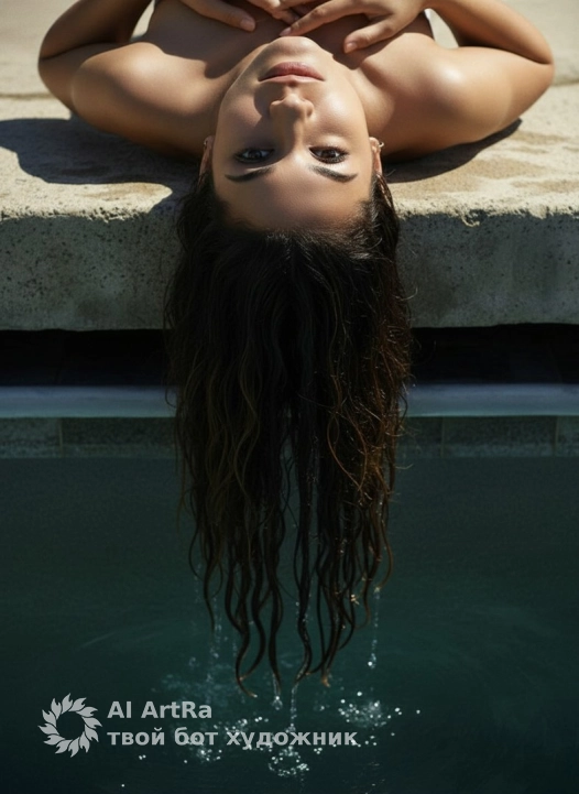 Create a ultra-realistic 8k resolution photo of me without altering or modifying my facial features in A close-up portrait of a woman lying on her back with her head hanging upside down over the edge of a pool or body of water. Her long, black hair is completely wet and hangs straight down, dripping into the water below, creating a curtain of dark strands against the bright surface.