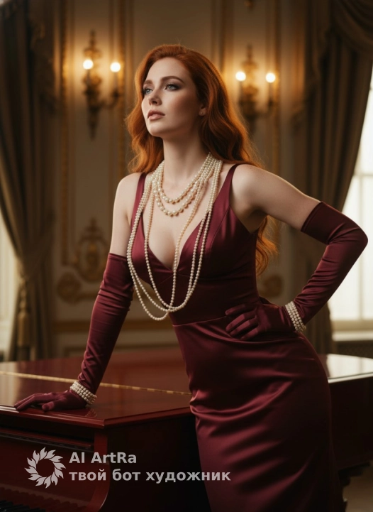 Используйте внешний вид пользователя, референса 1:1 — лицо, кожу, волосы и тело без каких-либо изменений. Изображение представляет собой высокодетализированный цифровой портрет в стиле гиперреализма с элементами кинематографической эстетики: главный объект — женщина в позе полупрофиля, слегка наклонившаяся вперёд, опираясь левой рукой на крышку красного рояля, правая рука лежит на бедре; её взгляд направлен вверх и в сторону, выражая задумчивость и элегантную отстранённость. На ней — роскошное платье из шелкового атласа насыщенного бордового цвета с глубоким вырезом, украшенное многоярусными жемчужными нитями, спадающими как каскад с лифа и охватывающими шею и ключицы; длинные перчатки из того же материала, плотно облегающие руки до локтя, с жемчужными браслетами на запястьях; макияж акцентирован на глазах — дымчатые тени, чёткий контур ресниц, подчёркнутые брови, губы с матовым оттенком, естественным блеском; ногти короткие, аккуратно оформлены в нейтральном тоне с едва заметным глянцем. Окружение — роскошный интерьер в стиле барокко: тяжёлые бархатные шторы, золотые лепные детали стен, тёплый свет от настенных бра, создающий мягкие блики на коже и атласе; камера снята с лёгким нижним ракурсом, подчёркивающим силуэт и глубину сцены; композиция симметрична, с акцентом на рояль как на центральный элемент; настроение — аристократичное, меланхоличное, с оттенком театральной драмы; цветовая палитра — тёплая, с доминированием бордового, золотого и кремового, контрастирующих с тенями в глубине кадра; масштаб — средний план, от колен до макушки, с фокусом на верхней части тела и лице.