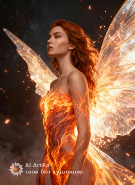 Используйте внешний вид пользователя, референса 1:1 — лицо, кожу, волосы и тело без каких-либо изменений. Цифровая фантастическая живопись в стиле эпического фэнтези с элементами магического реализма: женская фигура в профиль, слегка повернутая к зрителю, с плавными, грациозными линиями тела, покрытого живым пламенем, напоминающим огненную вену или энергетические потоки, исходящие от кожи и перетекающие в огромные, полупрозрачные крылья, наполненные светом и искрами. Макияж отсутствует, маникюр и педикюр не видны, украшений нет. Освещение драматическое, с ярким контровым светом, подчеркивающим силуэт и текстуру огня, фон — глубокая тьма с плавающими искрами и тлеющими частицами, создающими ощущение космического или магического пространства. Камера снята с низкого ракурса, слегка сбоку, фокусируясь на профиле и верхней части тела, масштаб — средний план, подчеркивающий силу и величие образа. Атмосфера — мистическая, возвышенная, наполненная внутренней силой и тихой мощью, эмоции — сосредоточенность, спокойная уверенность, божественное достоинство. Одежды нет, тело полностью обнажено, но скрыто под огненной аурой, поза — статичная, благородная, с поднятой головой и слегка опущенными плечами, как будто персонаж только что приземлился или готовится взлететь.