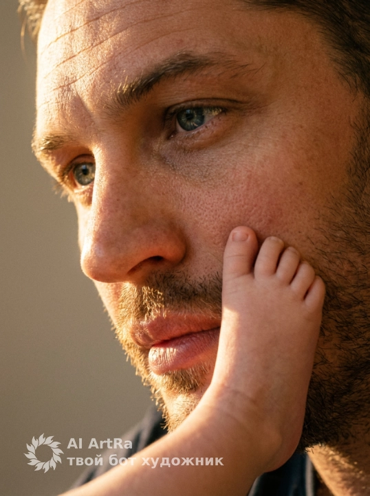Кинематографический эффект с добавлением зерна Ультрареалистичный экстремально крупный план части лица, мужчина наклонился, в кадре только лицо. Фото снизу, с низкого ракурса все фото залито солнечным светом К его щеке прикасается одна маленькая, крошечная ножка младенца Мужчина смотрит на него. Не меняй черты лица Фото в золотой час Фон минималистичный и нейтральный, что усиливает спокойную и элегантную атмосферу.