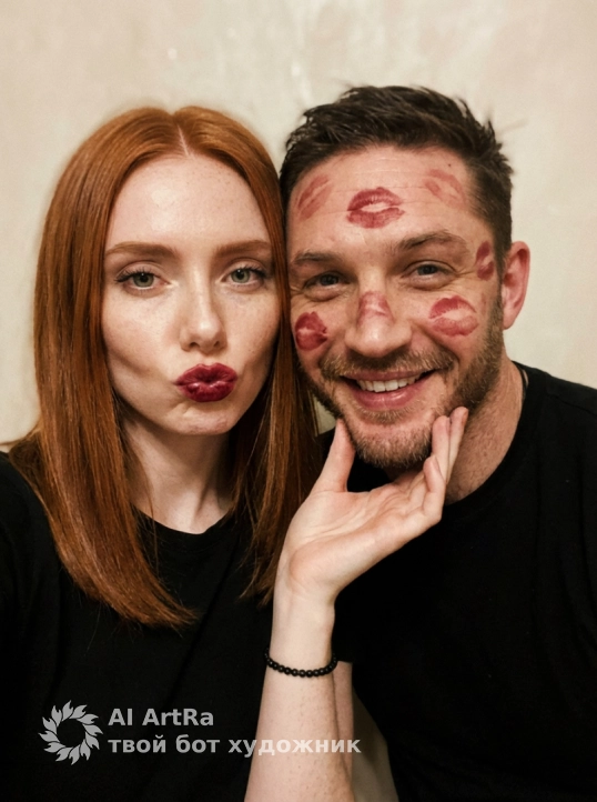 С правой стороны — парень, прическа сохранена с референса. Лицо парня почти полностью покрыто темно-красными поцелуями. Парень улыбается.