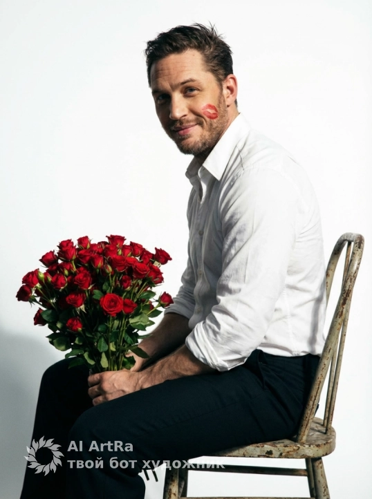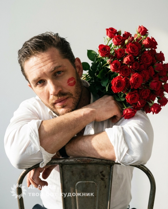 На плече рукой он держит букет огромный красных кустовых роз Одна рука опирается на спинку стула Он смотрит прямо в камеру с дерзким выражением лица. Освещение мягкое, с лёгким акцентом на его лицо, создавая тени и подчеркивая черты. Фон белый минималистичный и нейтральный, что усиливает спокойную и элегантную атмосферу.