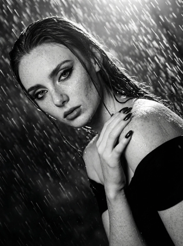 Фотосессия под дождём: драматичный чёрно-белый портрет