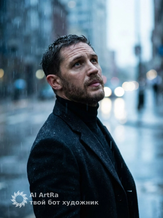 Portrait of a man standing in heavy rain and looking up, medium shot, low-angle, 3/4 perspective. Man in a black coat and black turtleneck. Location: blurred urban background in rainy weather. Diffused cool daylight in overcast weather with raindrops on clothes and hair. Soft shadows. Melancholic and cinematic atmosphere. Shot with an 85mm lens with a shallow depth of field. Creamy bokeh in the background. Photorealistic style. Color palette with predominantly black and cool blue tones. Highly detailed, photorealistic. Shot on a film camera.
